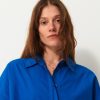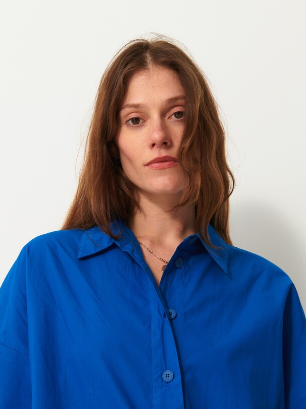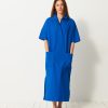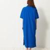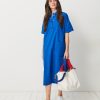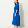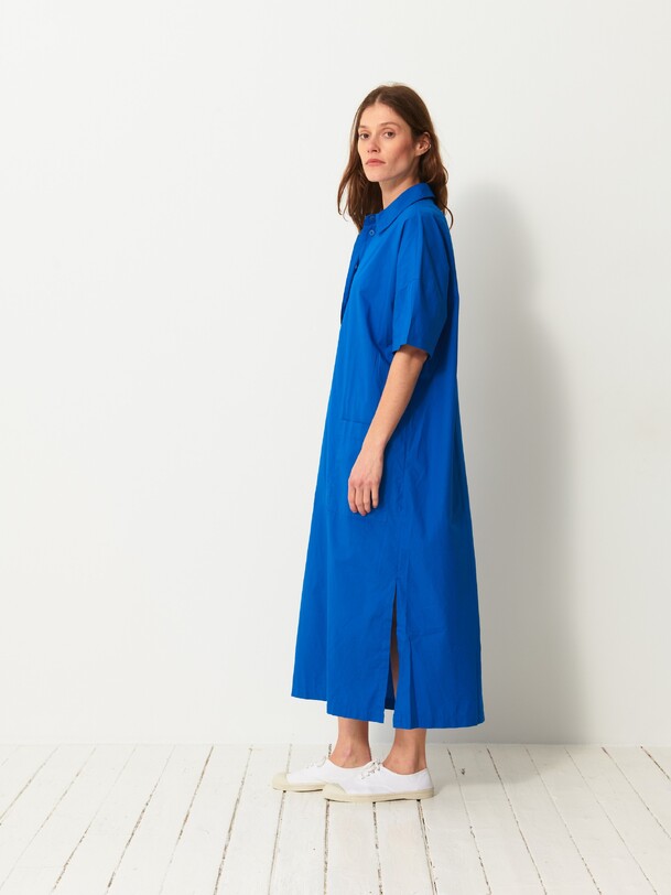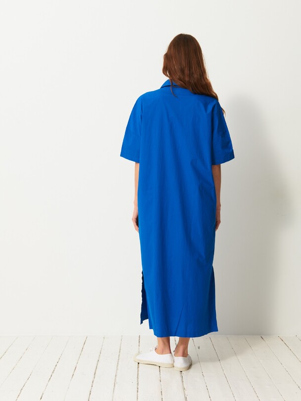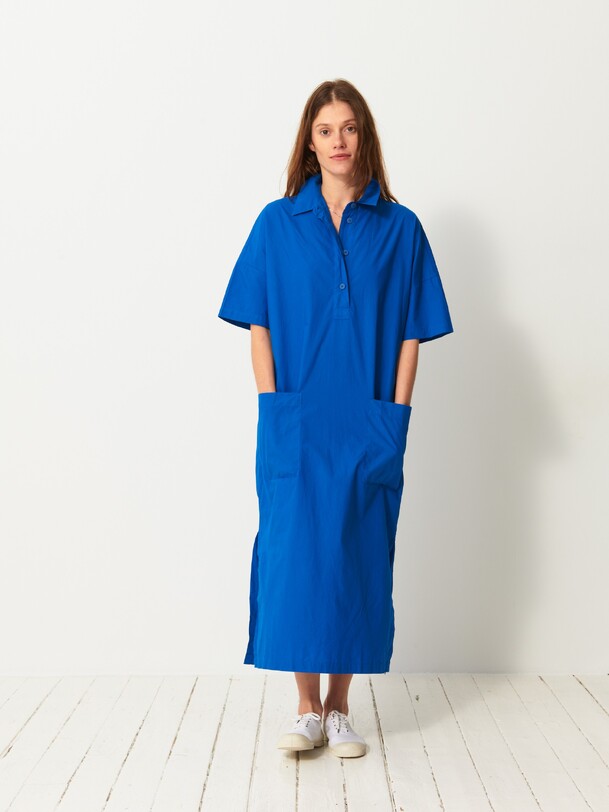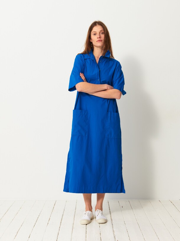 The Nora dress features short sleeves and a straight cut, falling to mid-calf length. It’s designed with a polo-style collar. Patch pockets with topstitching add detail, while side slits introduce a touch of modernity.