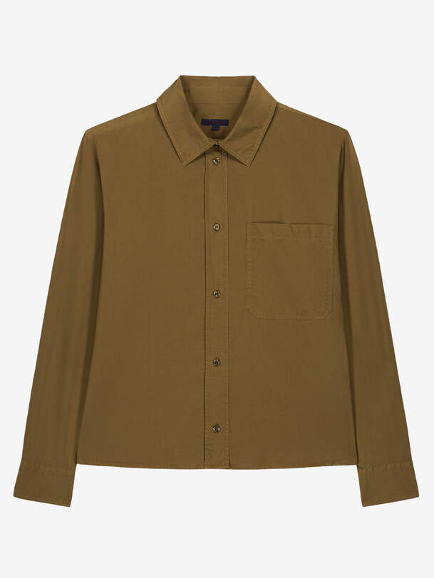 In its Dark Olive version, the Olga shirt takes on an autumnal tone. With a straight cut, a neat patch pocket and a shirttail hem, every detail counts. Perfect for a wardrobe that is both utilitarian and elegant.