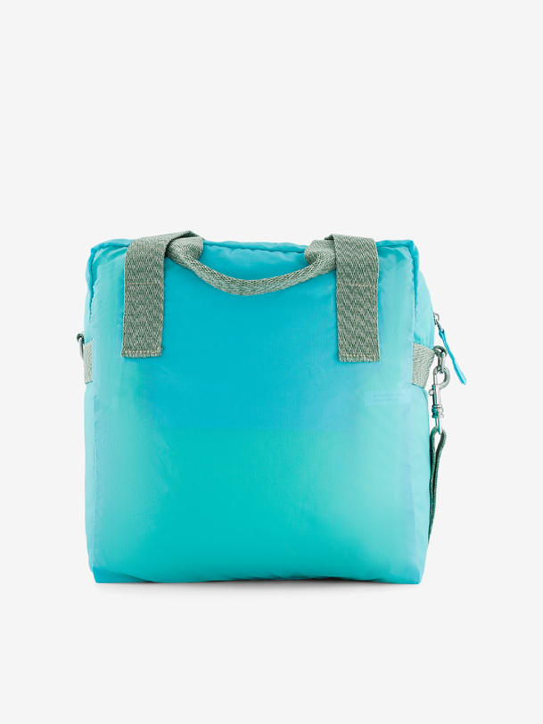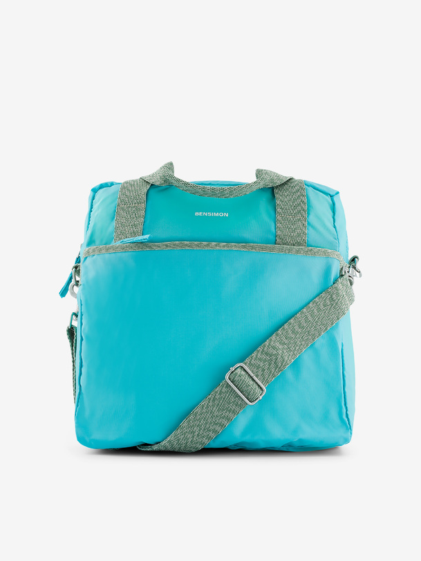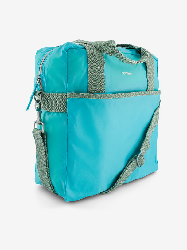 The One Day bag is a medium-sized bag. It features a zippered front pocket, a double handle, and an adjustable strap. It includes three pockets in total: two zippered pockets and one interior zippered pocket. Its dimensions are 32 cm long, 15 cm wide, and 33.5 cm high. It has a zipper closure.