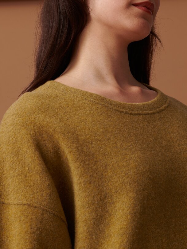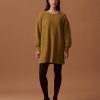 The Orelia dress is all about structured comfort: made from double-sided knit fabric, it features long, voluminous sleeves with fitted cuffs, a simple round neckline and patch pockets on the front. Its mid-thigh length makes it easy to wear on its own or with tights and boots. Made primarily from cotton and wool, it provides warmth and softness without being heavy — a versatile piece for cooler days.