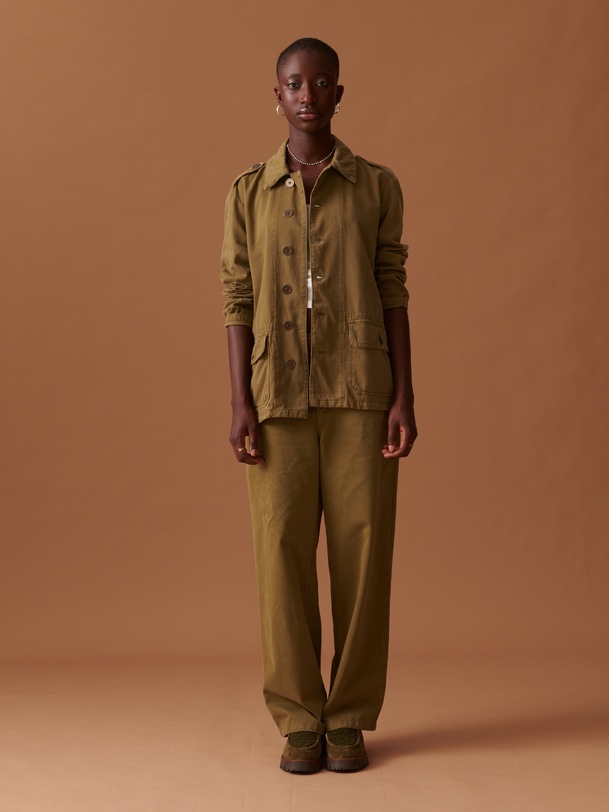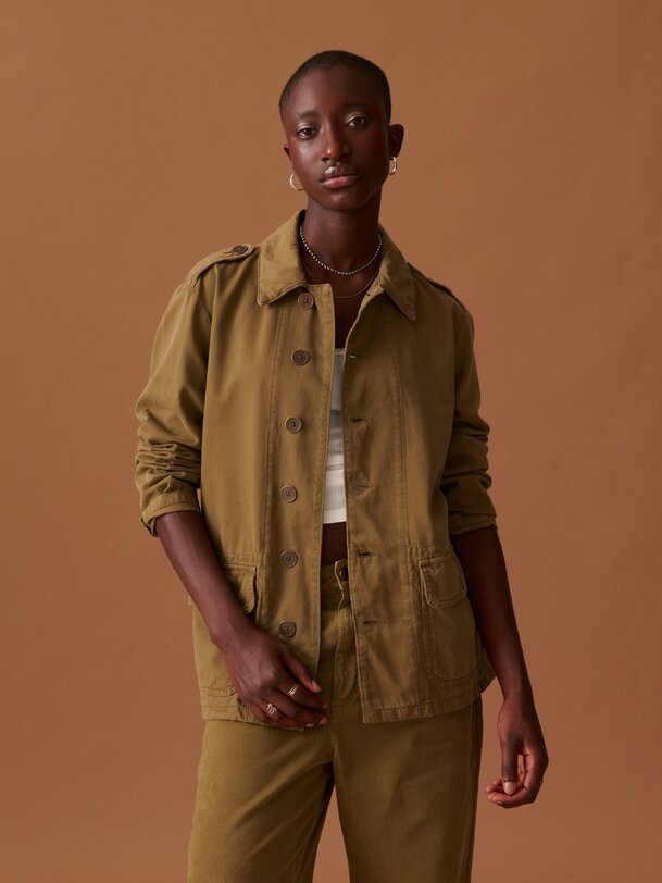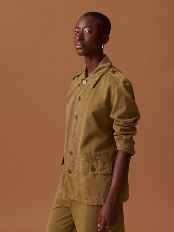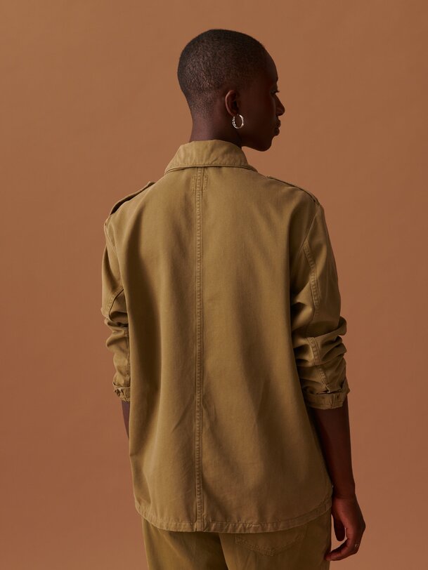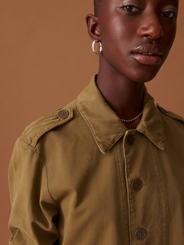 Crafted from 100% cotton gabardine, the Ozanna jacket embraces an elegant utilitarian style. In a bark-brown shade, it features a classic collar, epaulettes, and patch pockets with flaps, giving it a functional and structured look. Featuring a button-front fastening, long sleeves, and a slightly loose fit, this versatile piece is designed for layering and transitioning seamlessly through the seasons.