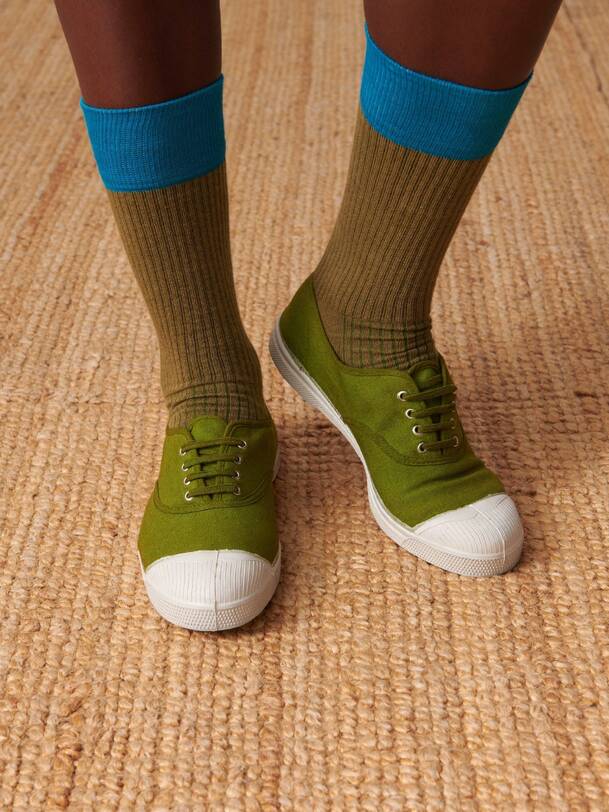 These tall ribbed socks prioritise everyday comfort: a knit made mainly from cotton for a soft, breathable feel, a straight construction with no defined heel to suit all foot lengths, and a cuff designed to be elegantly slouched at the ankle. Three complementary colours anchor the collection and let you match the finishing touch to the rest of your outfit — a soft, graphic take on the athletic sock.