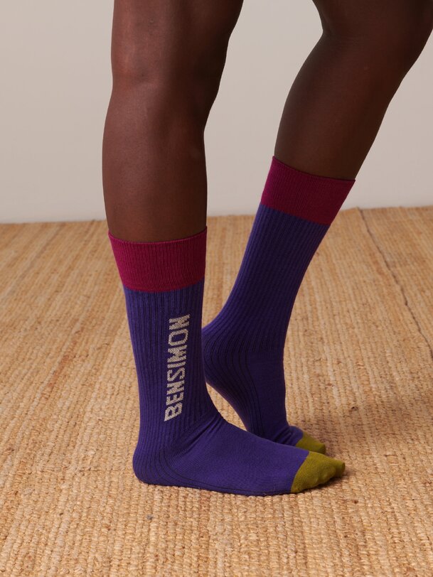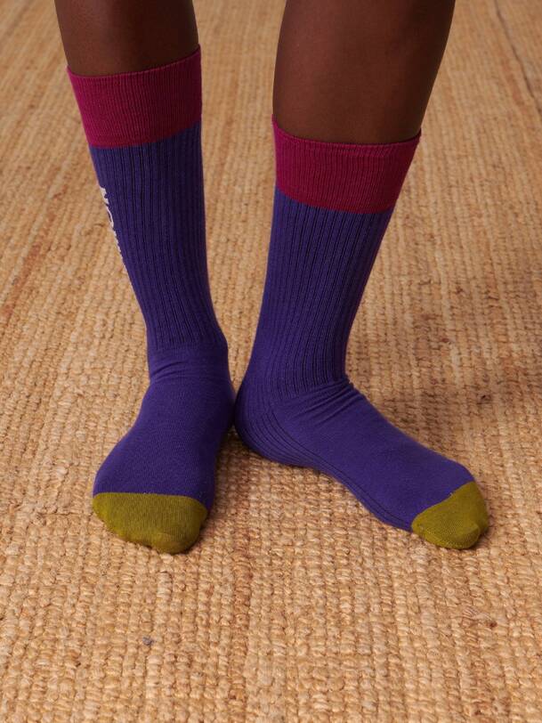 These tall ribbed socks put comfort first: a knit made primarily from cotton, a straight construction with no defined heel so they adapt to all foot lengths, and a supple finish designed to be elegantly slouched at the ankle. Three complementary colours let you match the final touch to any outfit — a soft, sporty take on a daily classic