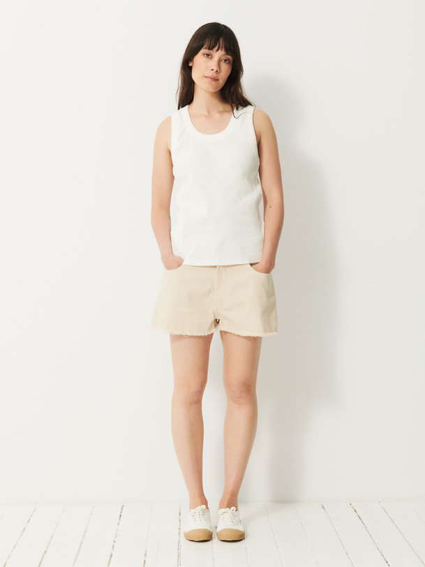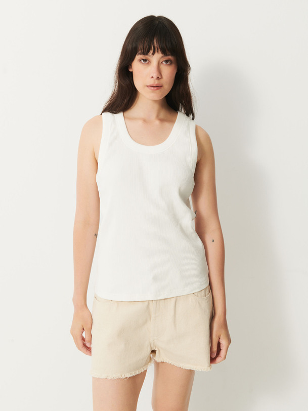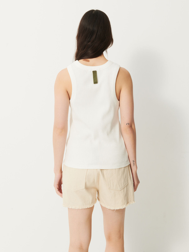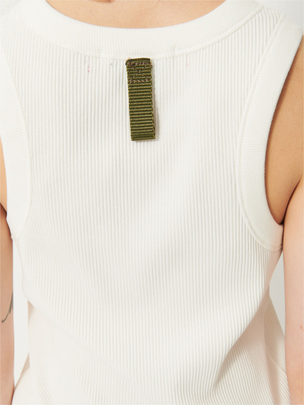 A fitted tank top in cotton with a hint of elastane for added comfort. Ribbed texture, rounded neckline, and a signature back detail — a khaki tab inspired by military uniforms. Minimal, structured, easy to wear. Part of the BENSIMON ÉDITION capsule designed with Arthur Robert, this piece updates a classic with a subtle army touch.